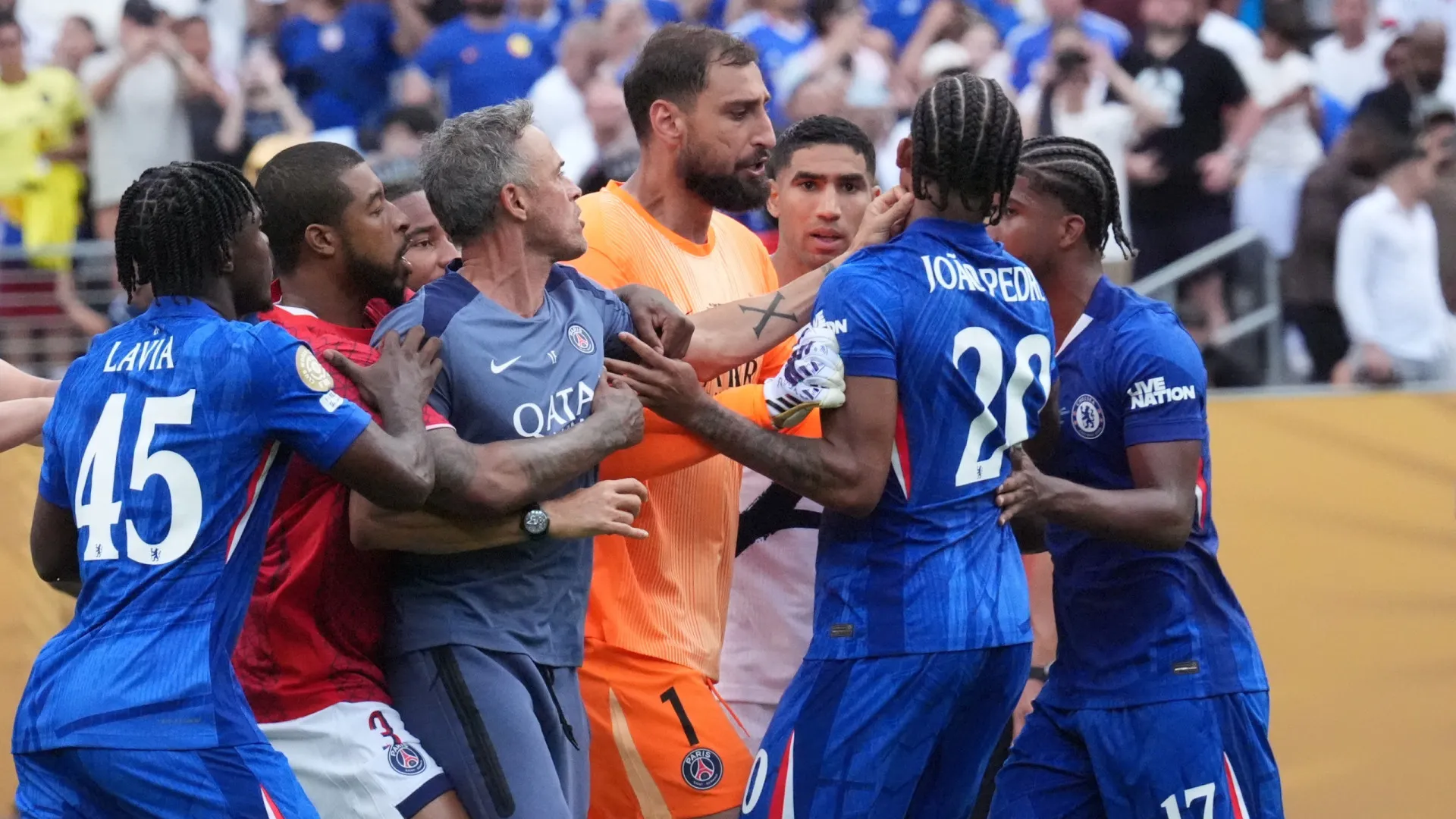 A final da Copa do Mundo de Clubes, neste domingo (13), terminou com confusão generalizada logo após a vitória do Chelsea sobre o Paris Saint-Germa…